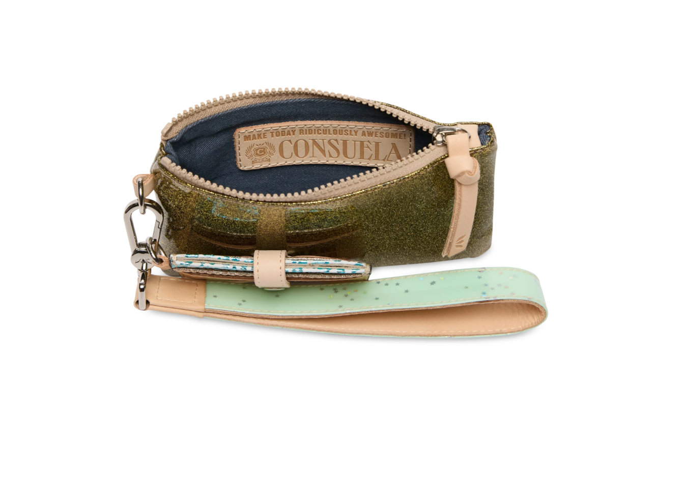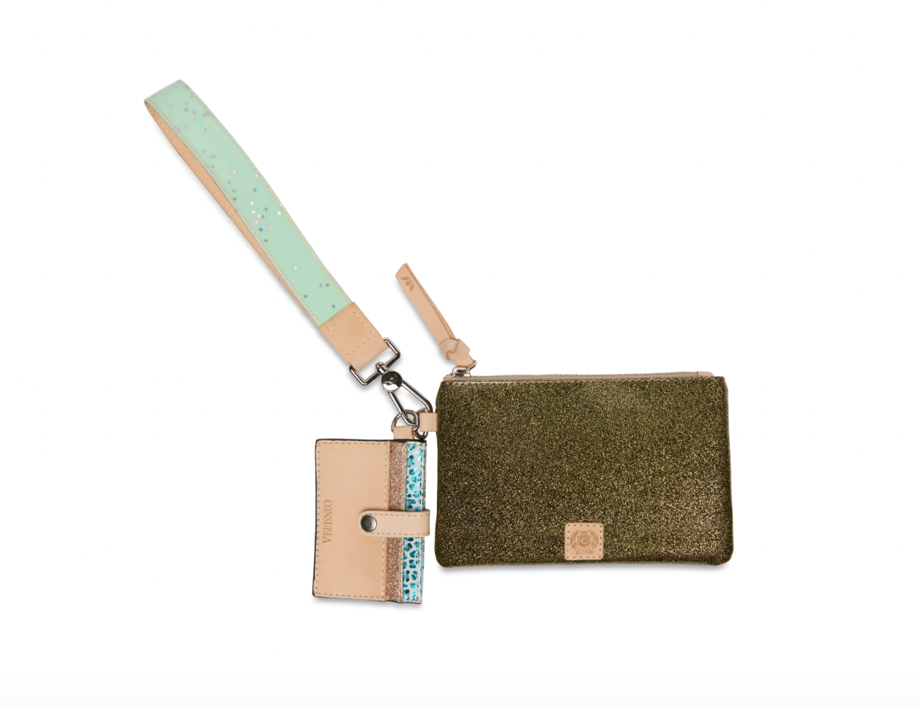 Add some sparkle to your everyday with the Combi, Oly set! Featuring an olive green glitter pouch trimmed in natural leather, a sleek Diego leather five-slot card wallet with a handy D-ring, and a vibrant turquoise glitter wristlet. Perfectly sized for your essentials, this playful trio adds fun and function to your day. Crafted with care in Mexico, it's a chic upgrade wherever you go.