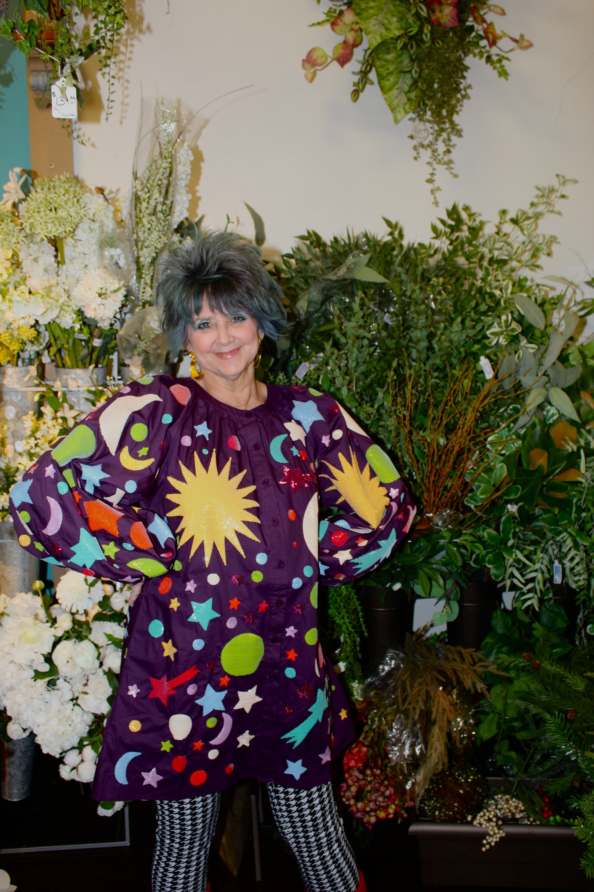 Step into the cosmos with this enchanting dark purple dress that's out of this world! Featuring a mesmerizing galaxy design crafted in shimmering sequins, this piece catches the light from every angle. The charming bubble sleeves add a whimsical touch, while the classic round neckline keeps things effortlessly wearable. Perfect for anyone who loves celestial vibes and a little sparkle in their wardrobe. Button-up style makes it easy to slip on and ready for your next adventure—whether that's a night out or just feeling stellar every day.