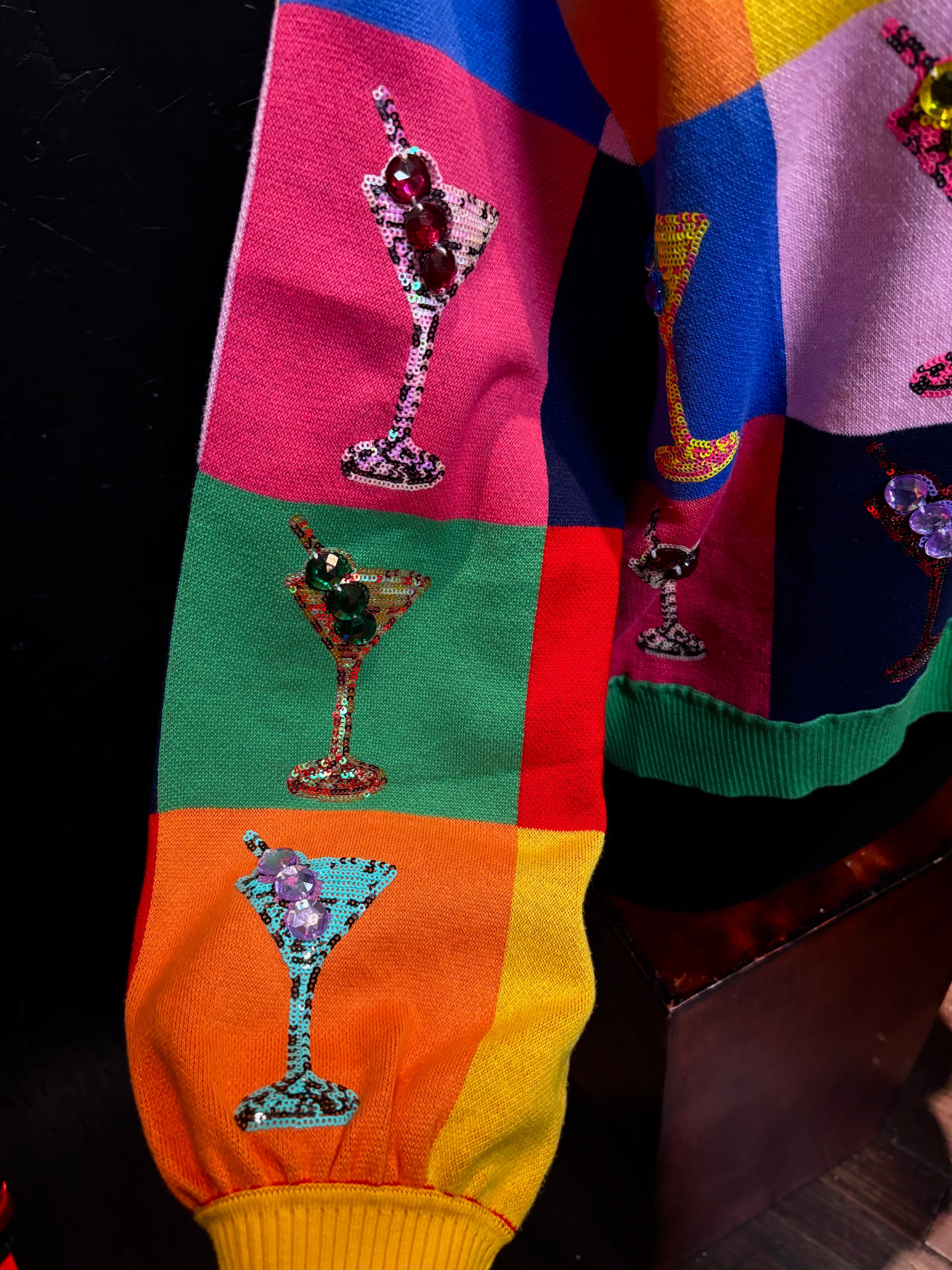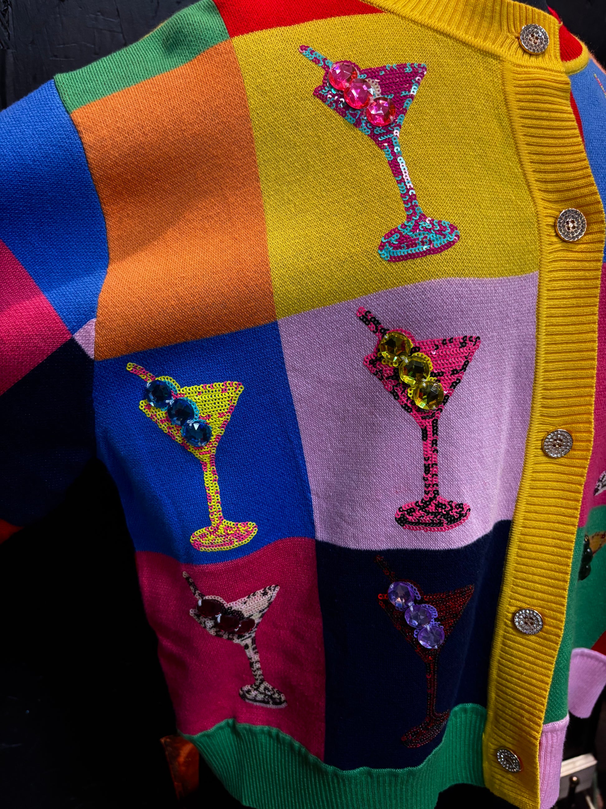 Raise a toast to style with this playful button-up cardigan! Featuring a vibrant checkered pattern where each colorful block is adorned with a shimmering sequin martini, it's the perfect piece for anyone who loves a little sparkle and sass. Whether you're heading to happy hour or just want to add some fun to your everyday look, this sweater brings the party vibes. Cozy, chic, and conversation-starting—your