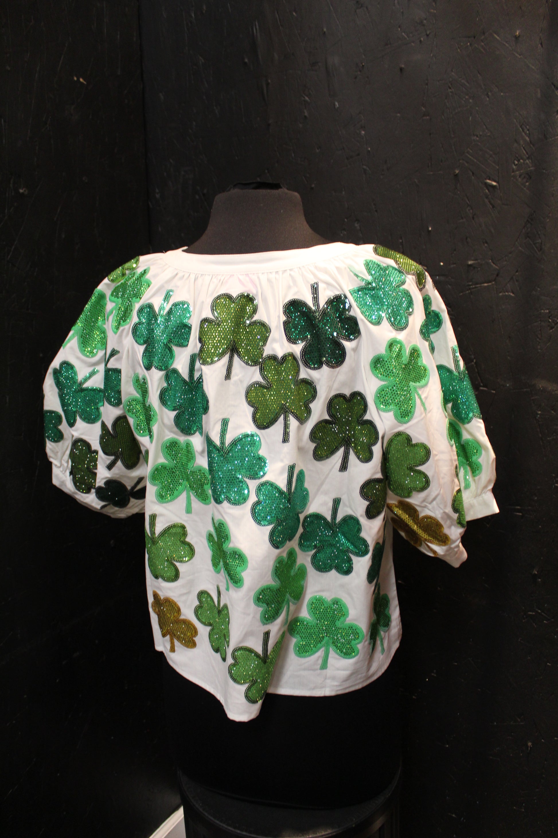 Luck of the Irish meets sparkle and shine with this charming white cotton button-up! Featuring eye-catching green rhinestone shamrocks scattered across the front and back, this top brings festive flair to any outfit. The playful puff sleeves add a touch of whimsy and vintage-inspired style. Perfect for St. Patrick's Day celebrations or whenever you want to add a little shimmer to your wardrobe. Comfortable, versatile, and absolutely dazzling!